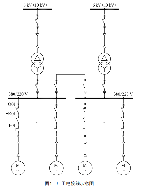 核電常規(guī)島廠用電系統(tǒng)設(shè)置2個(gè)電壓等級(jí),高壓廠用電系統(tǒng)采用6kV或10kV,低壓廠用電系統(tǒng)采用380/220V,每臺(tái)機(jī)組的低壓廠用母線通過低壓廠用變壓器與高壓廠用母線連接。正常運(yùn)行時(shí),每段母線分別帶負(fù)荷運(yùn)行,當(dāng)其中一段母線電源故障時(shí),由另外一段母線提供電源,低壓電動(dòng)機(jī)由低壓廠用母線直接供電。核電常規(guī)島廠用電系統(tǒng)接線如圖1所示。