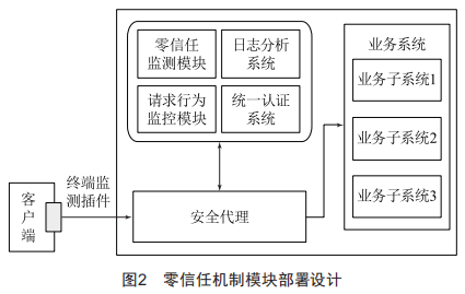 零信任機(jī)制模塊設(shè)計(jì)如圖2所示,主要包括客戶端模塊和服務(wù)端模塊。在客戶端,系統(tǒng)配備零信任終端監(jiān)測插件,提供零信任安全認(rèn)證機(jī)制中所需的身份令牌合法性檢查、安全代理請求等功能。在服務(wù)端,零信任機(jī)制模塊與業(yè)務(wù)系統(tǒng)分開,作為用戶行為的服務(wù)中間件,其主要包括零信任監(jiān)測模塊、請求行為監(jiān)控模塊、日志分析系統(tǒng)和統(tǒng)一認(rèn)證系統(tǒng)。