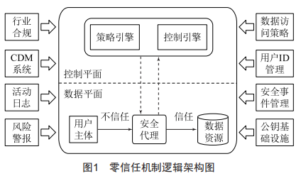 零信任機(jī)制本質(zhì)是一個(gè)更加完善的安全認(rèn)證架構(gòu),其邏輯架構(gòu)如圖1所示,由零信任核心組件和諸多外部數(shù)據(jù)源構(gòu)成。