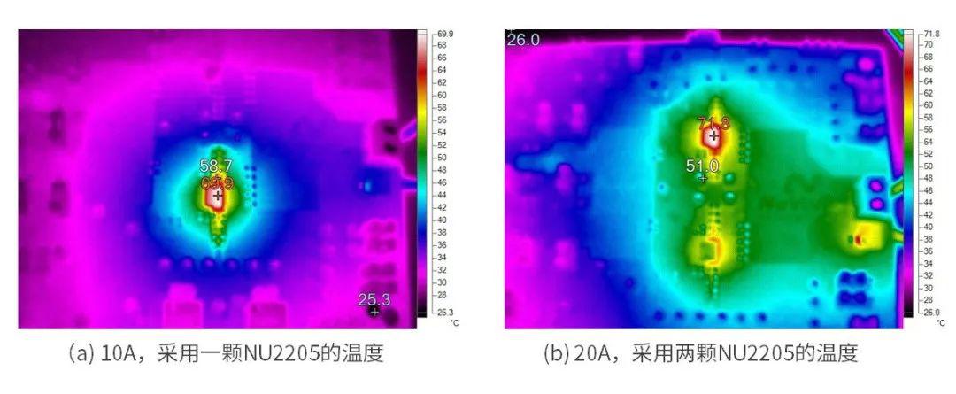 在25℃環(huán)境溫度16V輸入條件下,2節(jié)電池在10A和20A大電流下充電,溫升分別為44.9℃和46.8℃。