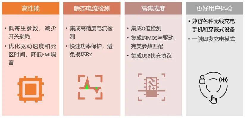 實現(xiàn)高效率無線充電還需要發(fā)射芯片(Tx),與接收芯片最大的不同是更高的EMI噪聲要求,需要降低寄生參數(shù),調(diào)整驅(qū)動速度和時間,以保證對其他電子設(shè)備非常友好。同時,每個發(fā)射端都要兼容市面上所有手機和可穿戴設(shè)備,這樣才能為這些設(shè)備充電。