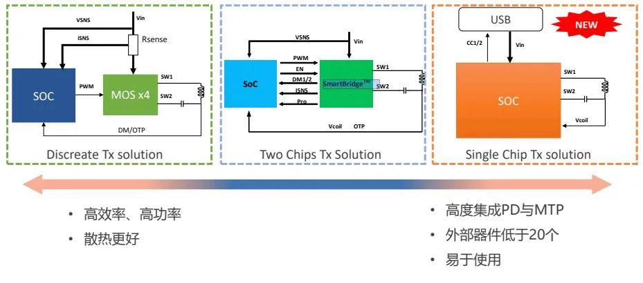他解釋說,第一種發(fā)射架構(gòu)實際上是主芯片控制分立元件,構(gòu)成一個整體無線充電發(fā)射方案;第二種是雙芯片發(fā)射方案,是伏達在業(yè)界推出的第一個SmartBridgeTM架構(gòu),它具有高可靠性,非常適合高EMI場合使用;第三個架構(gòu)是精簡的單芯片發(fā)射方案,所有無線充電功能集成在一顆芯片內(nèi),更加簡單易用。這三套方案伏達都有產(chǎn)品,可以滿足不同的應(yīng)用場景。