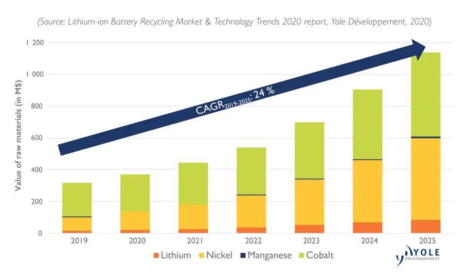 Yole分析師表示,2019年鋰離子電池回收市場總量約為9.38萬噸,2019-2025年復(fù)合年增長率為30%,期末達(dá)到45.9369萬噸。目前鋰離子電池原材料的回收利用價值約為3.15億美元,這個數(shù)字到2025年將達(dá)到11.37億美元,到2040年將達(dá)到23.81億美元。