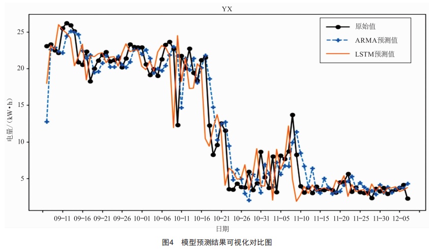 本文以Yx園區(qū)宿舍的數(shù)據(jù)為例分別進(jìn)行模型訓(xùn)練,將實(shí)際值與兩種預(yù)測(cè)模型得到的預(yù)測(cè)值進(jìn)行可視化,結(jié)果如圖4所示。由圖4可知兩種模型預(yù)測(cè)效果都較為不錯(cuò),走向與實(shí)際值大致相同。