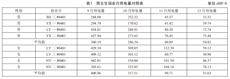 為了探究用電情況是否受性別影響,抽樣統(tǒng)計(jì)不同宿舍樓同宿舍號(hào)的9、10、11和12月的用電量情況,結(jié)果如表1所示。