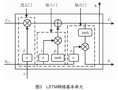 LSTM網(wǎng)絡(luò)的基本單元如圖3所示,fl,il,ol分別為遺忘門、輸入門、輸出門:xl,gl,hl,Cl分別為l時(shí)刻的輸入、輸入節(jié)點(diǎn)、中間輸出和細(xì)胞單元的狀態(tài):口、tanh分別為sigmoid和tanh函數(shù)變化。