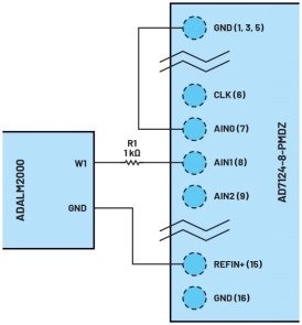 圖8.ADALM2000波形發(fā)生器用于生成一定范圍的正弦波頻率,以直接測(cè)量AD7124-8的濾波器響應(yīng)。雖然腳本將正弦波幅度和偏移設(shè)置為安全水平,1kΩ電阻可以在功能故障時(shí)保護(hù)AD7124-8。(ADALM2000的輸出電壓范圍為–5V至+5V,而AD7124-8的絕對(duì)最大限值為-0.3V和+3.6V。)