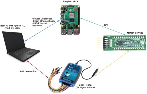 圖4.ADALM2000是一款多功能USB測(cè)試儀器,具有兩個(gè)通用模擬輸入和兩個(gè)輸出,采樣率分別為100 MSPS和150 MSPS。它可以作為簡(jiǎn)單的信號(hào)源,用于測(cè)量ADC噪聲帶寬和濾波器響應(yīng)。運(yùn)行支持AD7124器件驅(qū)動(dòng)器支持的內(nèi)核的樹(shù)莓派4作為AD7124和主機(jī)之間的簡(jiǎn)單橋梁。