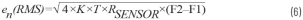 其中:eN (RMS)表示總噪聲。K表示波爾茲曼常數(shù)(1.38e-23 J/K)。T表示電阻的絕對(duì)溫度(開(kāi)氏度)。F2和F1表示相關(guān)頻段的上限和下限。將帶寬標(biāo)準(zhǔn)化至1Hz,以V/√Hz為單位表示噪聲密度。