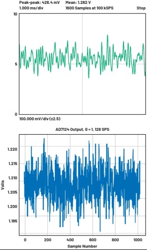 ADALM2000噪聲發(fā)生器可用于驗(yàn)證這一結(jié)果。設(shè)置測(cè)試噪聲發(fā)生器生成1000μV/√Hz的頻段會(huì)導(dǎo)致約5.69mV rms的總噪聲,測(cè)量出的總噪聲約為5.1mV rms。示波器捕獲的ADC輸入信號(hào)在ADC輸出數(shù)據(jù)旁邊繪出,如圖29所示。注意,測(cè)量到的峰峰值噪聲為426mV,而ADC的峰峰值噪聲約為26mV。雖然在真實(shí)的精密信號(hào)鏈中,是無(wú)法實(shí)現(xiàn)如此高的噪聲水平的(雖然希望如此),但本練習(xí)表明,可以將ADC的內(nèi)部濾波器作為信號(hào)鏈中的主要帶寬限制元件,從而降低噪聲。