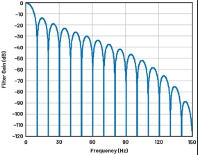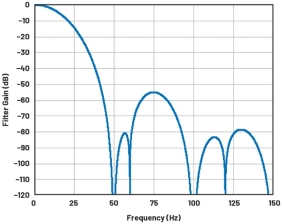 圖12.AD7124-8 50Hz/60Hz拒波濾波器響應(yīng)是50Hz sinc3濾波器和60Hz sinc1濾波器的組合。