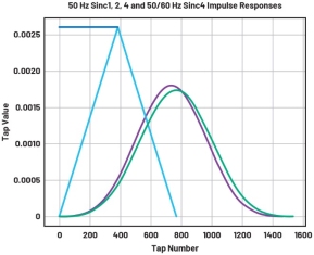 圖15.將sinc3 50Hz陷波濾波器與sinc1 60Hz濾波器進(jìn)行卷積,將產(chǎn)生強(qiáng)烈抑制50Hz和60Hz的復(fù)合響應(yīng)。