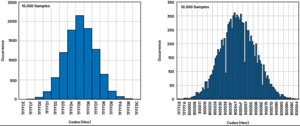 圖2.在PGA增益為1時(shí)(左側(cè)),AD7124輸出噪聲中顯示13個(gè)代碼,標(biāo)準(zhǔn)偏差為約2.5個(gè)代碼。當(dāng)量化噪聲可見(jiàn)時(shí),熱噪聲更為顯著。在PGA增益為128時(shí)(右側(cè)),顯示187個(gè)代碼,量化噪聲是無(wú)關(guān)緊要的。截?cái)嘁粋€(gè)或兩個(gè)最低有效位(雙倍或四倍量化噪聲)不會(huì)導(dǎo)致信息丟失。