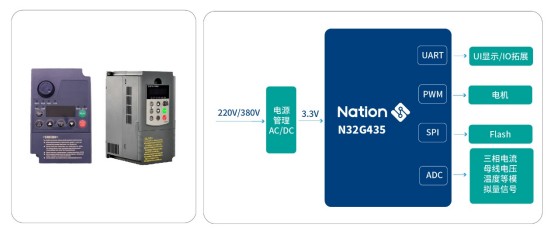 該類(lèi)應(yīng)用中已獲得量產(chǎn)的型號(hào)包括N32G031、N32G435、N32G455、N32G457等,其中國(guó)民技術(shù)N32G435等系列具有接口豐富、系統(tǒng)穩(wěn)定、開(kāi)發(fā)簡(jiǎn)易、加密安全等特點(diǎn),可為變頻器實(shí)現(xiàn)人機(jī)UI交互、電機(jī)PWM驅(qū)動(dòng)、ADC多路模擬量采集、SPI Flash讀寫(xiě)、片內(nèi)Flash加密存儲(chǔ)以及讀寫(xiě)保護(hù)等多種功能提供支持。