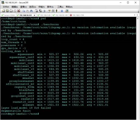 先把開發(fā)環(huán)境下目標文件系統(tǒng)arm目錄下/usr/lib下的libgomp.so.1文件復制到開發(fā)板的/usr/lib下,這個文件是并行計算庫,ncnn編譯時用到了這個庫,這個庫在多核處理器上能夠支持執(zhí)行并行計算。然后再在i.MX6UL/i.MX6ULL開發(fā)板執(zhí)行benchmark,執(zhí)行輸出結果如下圖: