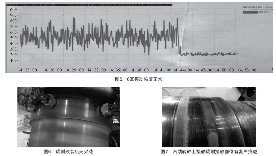 就地測(cè)#6軸瓦振動(dòng)、溫度正常,就地聽音正常,但檢查發(fā)現(xiàn)#6軸承座的發(fā)電機(jī)大軸接地碳刷時(shí)常發(fā)生跳火現(xiàn)象,且時(shí)有爆鳴狀火花。對(duì)發(fā)電機(jī)接地碳刷滑環(huán)清理并更換接地碳刷后振動(dòng)稍有好轉(zhuǎn),但過不了多久振動(dòng)再次加劇。據(jù)此分析,很可能是由于電火花干擾#6軸承座的振動(dòng)測(cè)量元件,使其軸振異常升高。