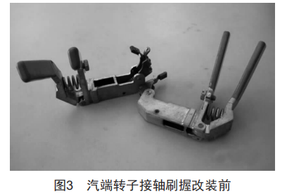 由于制造廠選用刷盒尺寸較小,碳刷截面積、彈簧壓力均偏小,在現(xiàn)場(chǎng)惡劣的運(yùn)行環(huán)境下易產(chǎn)生振動(dòng),使碳刷破裂及磨損嚴(yán)重:又因發(fā)電機(jī)汽端密封瓦蓋處長(zhǎng)期有油汽滲出,油污及碳粉附著在測(cè)量碳刷的刷架和轉(zhuǎn)軸上,增大了碳刷與轉(zhuǎn)軸之間的接觸電阻,易產(chǎn)生火花。最終,向設(shè)備管理部申請(qǐng)利用停機(jī)檢修的機(jī)會(huì),將刷握進(jìn)行改裝,增大刷盒的尺寸,即增加碳刷與轉(zhuǎn)軸的接觸面。