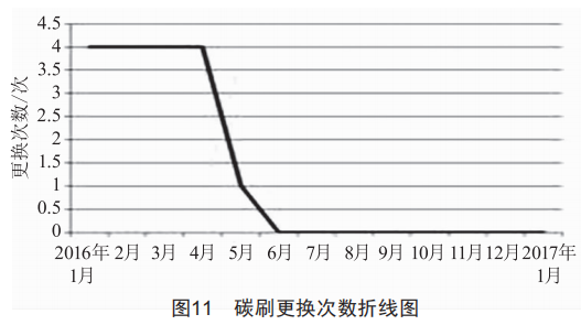 (1)降低了碳刷維護(hù)成本,節(jié)省兩臺(tái)1000Mw機(jī)組原碳刷每年的維護(hù)費(fèi)用近50萬元,碳刷更換次數(shù)大大減少(圖11)。