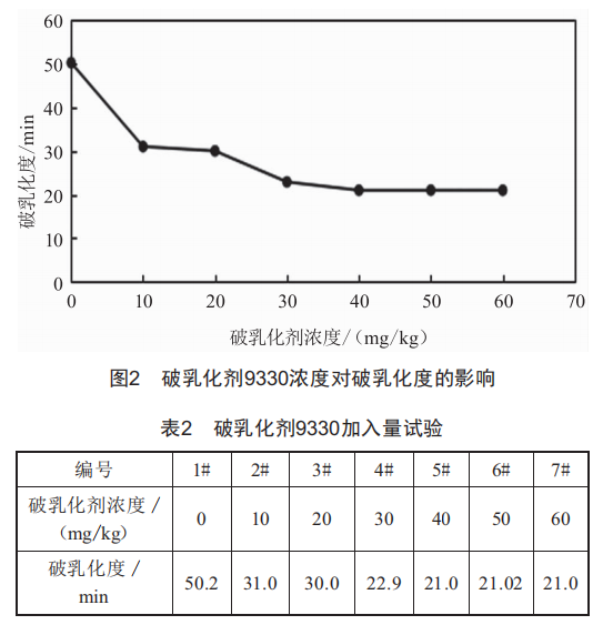 由圖2可以看出,隨著破乳化劑濃度的增大,破乳化度先減少后幾乎保持不變,當(dāng)破乳化劑9330濃度為40mg/kg時(shí),破乳化效果最好,破乳化度為21.0min。