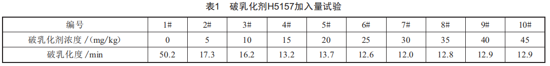 由圖1可以看出,隨著破乳化劑濃度的增大,破乳化度先逐漸減少后有微微上升趨勢(shì),當(dāng)破乳化劑H5157濃度為15mg/kg時(shí),破乳化效果最好,破乳化度為13.2min,繼續(xù)增大破乳化劑濃度,破乳化度幾乎不變。