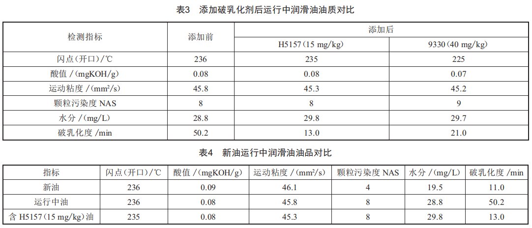 由表3可以看出,添加兩種破乳化劑均能使?jié)櫥偷钠迫榛Ч玫斤@著改善,其中添加H5157的破乳化時(shí)間更短,添加破乳化劑前后,潤(rùn)滑油的閃點(diǎn)、酸值、粘度、水分沒有明顯變化。添加破乳化劑9330后,潤(rùn)滑油的顆粒度增大,這可能是因?yàn)槠迫榛瘎?330加入后形成了乳狀顆粒物。添加破乳化劑9330后,潤(rùn)滑油的閃點(diǎn)較添加前降低了11℃,說(shuō)明破乳化劑9330的存在使?jié)櫥桶l(fā)生了一定的劣化反應(yīng),造成潤(rùn)滑油的閃點(diǎn)大幅降低,閃點(diǎn)降低超過(guò)10℃,不建議添加此破乳化劑。