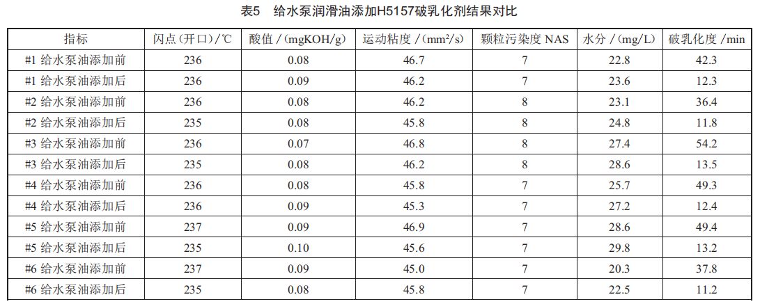對(duì)于破乳化度超標(biāo)、其他指標(biāo)正常的潤(rùn)滑油,合理添加破乳化劑H5157、n330均能起到明顯改善破乳化度的效果。但是,破乳化劑n330存在使?jié)櫥烷W點(diǎn)降低、顆粒污染度上升的風(fēng)險(xiǎn)。添加破乳化劑H5157則能在不改變潤(rùn)滑油閃點(diǎn)、酸值、粘度、顆粒污染度、水分等主要指標(biāo)的前提下將潤(rùn)滑油的破乳化值降低到與新油接近的水平,且6臺(tái)給水泵潤(rùn)滑油實(shí)際添加H5157后均取得了較好的效果。