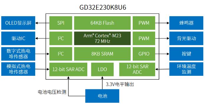 以非接觸式紅外額溫計(jì)為例,通常由低功耗、高安全性的GD32E230系列MCU、電源模塊、按鍵模塊、紅外傳感器模塊、OLED或LCD顯示模塊、語音模塊或者喇叭組成。