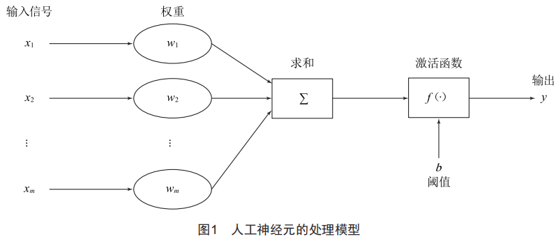 人工神經(jīng)網(wǎng)絡(luò)是模擬生物神經(jīng)網(wǎng)絡(luò)進(jìn)行信息處理的一種數(shù)學(xué)模型,人工神經(jīng)元是人工神經(jīng)網(wǎng)絡(luò)操作的基本信息處理單位。處理模型如圖1所示。