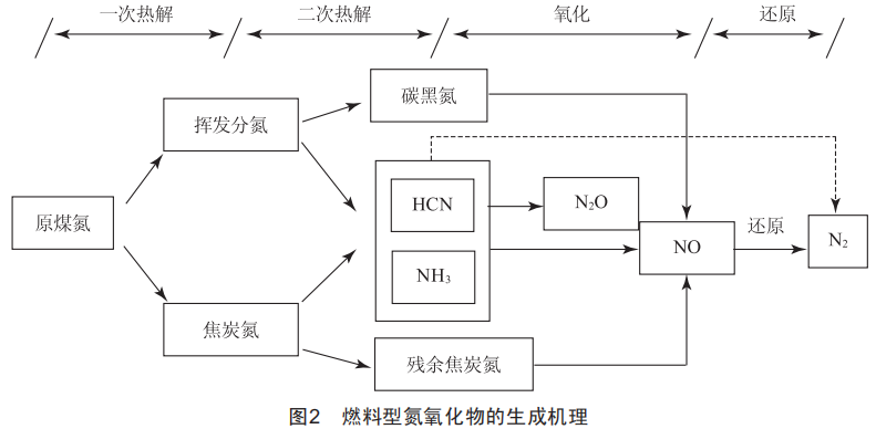 大量的研究表明,污染物氣體氮氧化物的排放量與鍋爐的燃燒過(guò)程存在著密切的聯(lián)系。燃燒過(guò)程中生成的三類(lèi)氮氧化物中,燃料型氮氧化物的占比最大,它是由燃料中的氮化合物發(fā)生熱分解、氧化而生成的。燃料型氮氧化物的生成機(jī)理如圖2所示。