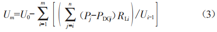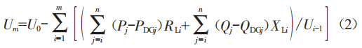 當(dāng)分布式光伏電源接入饋線后,相當(dāng)于在節(jié)點處增加新的有功或無功出力,節(jié)點不再是單純的負(fù)荷節(jié)點,其等效為潮流網(wǎng)絡(luò)中的P○節(jié)點。所以,在n個光伏電源接入之后線路上第m個節(jié)點的電壓Um為: