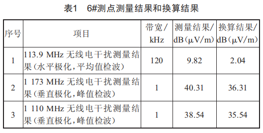 6#測點113.9MHz、1173MHz和1110MHz頻率測量結(jié)果和換算結(jié)果的典型值如表1所示。