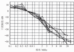 傅里葉分析和大量實測數(shù)據(jù)驗證表明,架空電力線的電暈干擾頻譜幅度較高,但這種干擾主要能量集中在l0MHz以下,30MHz以上干擾隨頻率增高幅值下降很快。圖2為特高壓輸電線路運行后常年觀測所統(tǒng)計的無線電干擾頻譜特性,從圖中可以看出,l0MHz以后,干擾幅值相對于0.5MHz已下降了30~40dB,不會形成有效干擾。