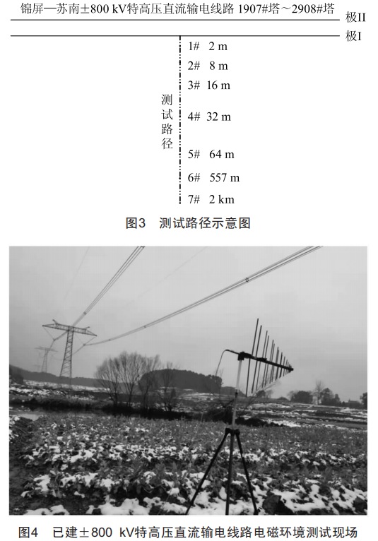 以邊導(dǎo)線地面投影為0點設(shè)置測點,如圖3所示,1#~7#測點分布在距0點2m~2km的位置,天線中心離地高度2m,測量現(xiàn)場照片如圖4所示。
