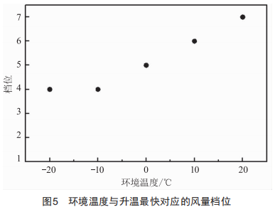 圖5總結(jié)了環(huán)境溫度與升溫最快對應(yīng)的風(fēng)量檔位,可以看出環(huán)境溫度對最佳采暖風(fēng)量的影響較大,隨著環(huán)境溫度從-20℃變化到20℃,最佳采暖風(fēng)量從4擋變化到7擋。該結(jié)論為用戶冬季選擇最佳風(fēng)量提供了參考,還可為主機(jī)廠制訂自動空調(diào)控制策略提供指導(dǎo)。