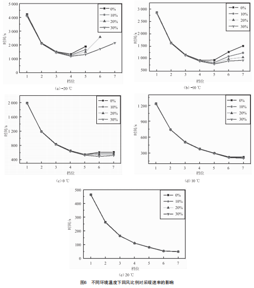 (1)最高升溫速率對應(yīng)的風(fēng)量往往不是最大風(fēng)量,而是與環(huán)境溫度相關(guān)。環(huán)境溫度為20℃時,最佳采暖風(fēng)量為7擋,隨著環(huán)境溫度下降,與之對應(yīng)的采暖風(fēng)量逐漸降低,環(huán)境溫度為-20℃時,最佳采暖風(fēng)量為4擋。