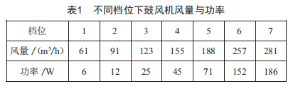 該系統(tǒng)中采用的PTC為水暖加熱器,最大加熱功率為7.5kw,熱效率為0.9。在實(shí)際使用過程中,由于水溫和水流量的限制,PTC往往不能工作在期望的功率下,其最大加熱功率與入口水溫和水流量之間的關(guān)系如圖3所示。水泵功率為100w,鼓風(fēng)機(jī)共有7個檔位,不同檔位下采暖風(fēng)量與功率如表1所示。