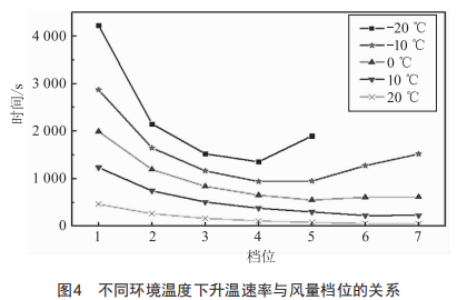 為適應(yīng)人群差異及使用需求,汽車空調(diào)出風(fēng)設(shè)置有多個檔位。在采暖初始階段,用戶普遍認(rèn)為風(fēng)量越大采暖效果越好,艙內(nèi)溫度將更快達(dá)到目標(biāo)溫度。若忽略風(fēng)速對乘員熱舒適性的影響,僅以乘員艙升溫速率作為評價指標(biāo),由于外循環(huán)時空調(diào)系統(tǒng)負(fù)荷大,最高擋風(fēng)量并不一定就是最佳采暖方案。