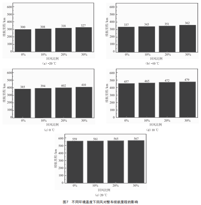 (4)-20℃環(huán)境溫度下30%的回風(fēng)比無回風(fēng)續(xù)航里程提升了27km,而隨著環(huán)境溫度的升高,回風(fēng)對續(xù)航里程的提升效果逐漸減弱,20℃環(huán)境溫度下30%的回風(fēng)僅提升了8km。