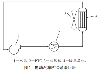 以PTC作為采暖部件的電動汽車采暖回路如圖1所示,其主要由水泵、PTC、暖風(fēng)芯體和鼓風(fēng)機(jī)等組成,電機(jī)余熱回收及電池加熱本文暫不考慮。