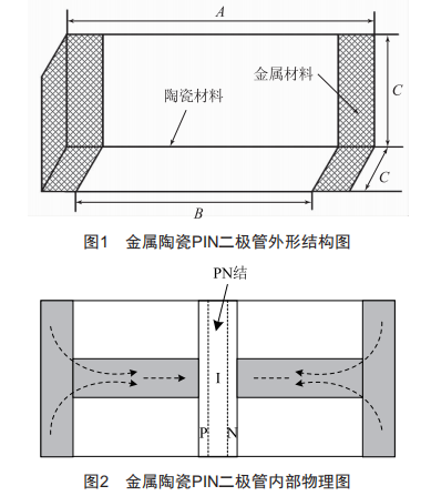 金屬陶瓷PIN二極管的內(nèi)部物理結(jié)構(gòu)如圖2所示,內(nèi)部PN結(jié)封裝在中心位置,其中1區(qū)是在P型結(jié)和N型結(jié)之間添加一種未摻雜的高阻本征半導體材料形成,可實現(xiàn)高功率、高耐壓、低電容等優(yōu)異的性能。