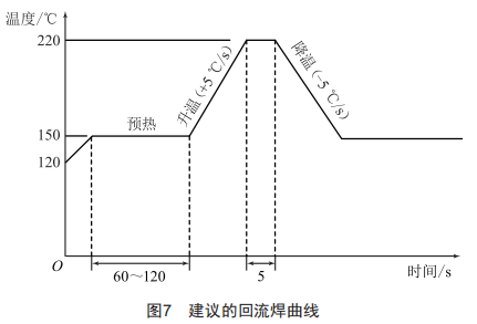 本器件一般建議使用回流焊,錫膏要求是融化溫度在190℃以內(nèi),含錫63%,含鉛37%,嚴格控制回流焊的焊接曲線,變溫速率不能太快,防止器件出現(xiàn)損傷。建議的回流焊曲線如圖7所示。