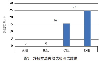 選取200只該型號PIN二極管分成4組,每組50只,A組采用低溫回流焊貼片,溫度最高280℃,最高溫度保持時間不超過5s:B組采用手動焊接,焊接溫度為280℃,停留時間不超過5s:C組采用低溫回流焊貼片,溫度最高360℃,最高溫度保持時間不超過5s:D組采用手動焊接,焊接溫度為360℃,停留時間不超過5s。對4組PIN二極管進行常溫電應(yīng)力測試,測試結(jié)果如圖3所示。