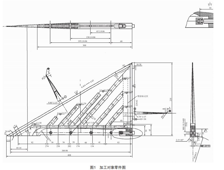 鈦合金結(jié)構(gòu)件翼面裝配弧面及定位槽的銑削加工成型零件圖如圖1所示,加工材料為TC4鈦合金?;谠摻Y(jié)構(gòu)件的復(fù)雜形狀以及鈦合金材料不佳的切削性能,對夾具系統(tǒng)做出了改進。在本文的工藝優(yōu)化措施下,切削質(zhì)量顯著提高,且加工效率有效提升。