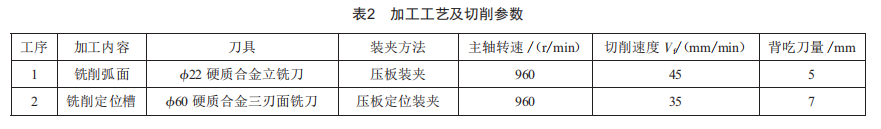 基本設(shè)計要求為:強度、剛度和穩(wěn)定性均需要提升,以保證夾具系統(tǒng)在加工過程中可以承受較大的力:進一步增大夾具系統(tǒng)的安裝面,以周邊接觸作為最佳接觸選擇。適用于銑床的夾具為保持定位,會選取定位鍵與自身平臺具有特定形狀的槽進行配合。定向鍵與夾具體配合多采用H7/h6,定位鍵與特定形狀槽(通常為T形槽)配合的部分預(yù)留出一定部分的余量進行修配,以保證最終的安裝精度,或通過在夾具正常使用時,使定位鍵的某一面與平臺特定形狀槽接觸,抵消安裝間隙。銑床夾具通常配有特殊設(shè)計的耳座,以螺栓連接的方式保證整個加工系統(tǒng)的緊密連接。加工工藝及切削參數(shù)如表2所示。