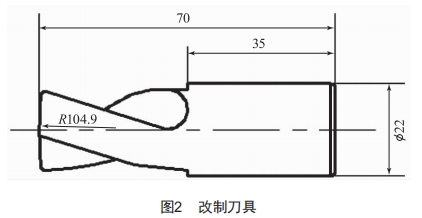 按加工鈦合金結(jié)構(gòu)件翼面的弧面要求,翼面弧面與鈦合金結(jié)構(gòu)件外殼弧面相吻合(圖1,R104.9)。傳統(tǒng)加工手段為通用的臥式銼床,但生產(chǎn)效率偏低(每日僅能加工4~5件),難以滿足目標(biāo)基本生產(chǎn)需求。本文提出了一種新的加工手段,選擇銑削方法加工弧面R104.9,以銑代銼,最終加工效率提高了5倍以上。而該方法需要對銑刀做出優(yōu)化改進,如圖2所示,同時需要對工藝路線進行修正。