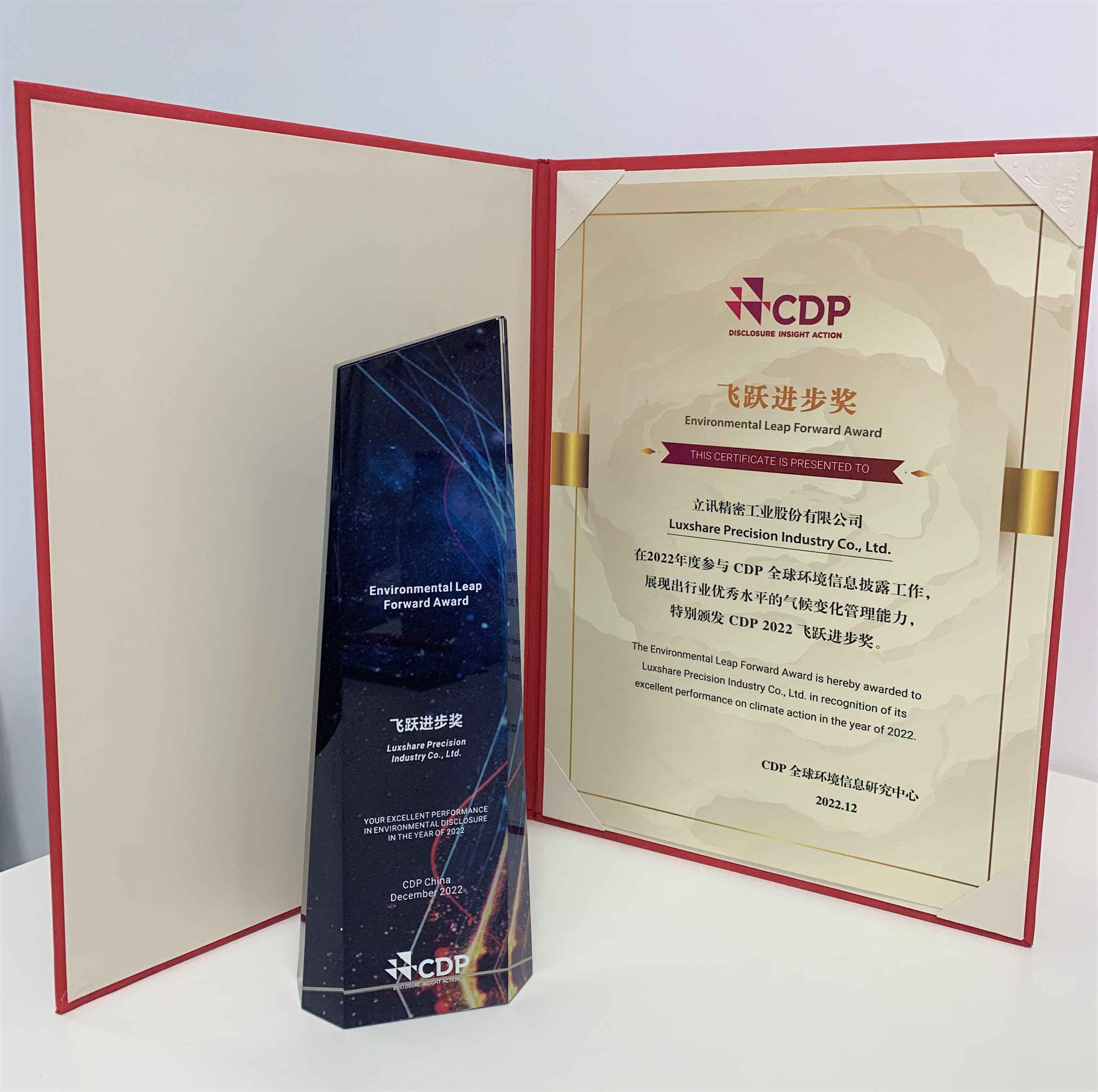 立訊精密榮獲“CDP2022環(huán)境信息披露優(yōu)秀企業(yè)飛躍進步獎”