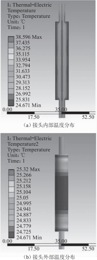 電纜接頭需要工作在理想的溫度下,電纜接頭產(chǎn)生的熱量一定程度上會向周圍傳遞,熱量傳遞的過程會影響溫度的分布。本文選擇電阻等效長度72mm,電流225A,環(huán)境溫度18℃,溫度分布圖如圖6所示。
