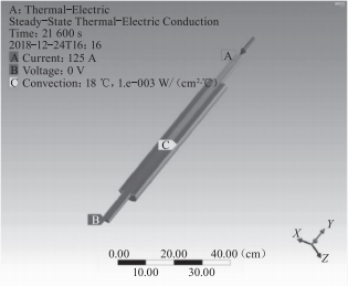 對電纜接頭進行電熱耦合模塊的仿真,設置電學類和熱學類邊界條件。添加電纜接頭流經(jīng)的電壓、電流,根據(jù)熱力學定律,設置在放熱過程中的邊界條件。