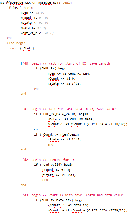 FPGA端的邏輯控制在chnl_tester.v中,它定義了一個狀態(tài)機,用于對數(shù)據(jù)收發(fā)進行控制。狀態(tài)機定義如下: