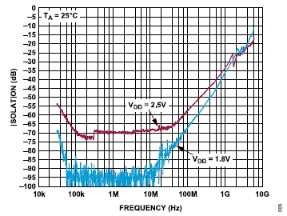 圖5.ADG901在關(guān)斷狀態(tài)下的隔離損耗性能